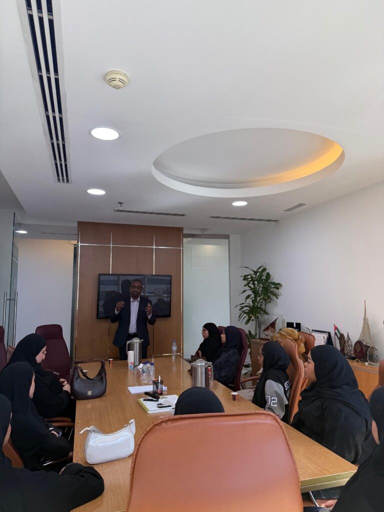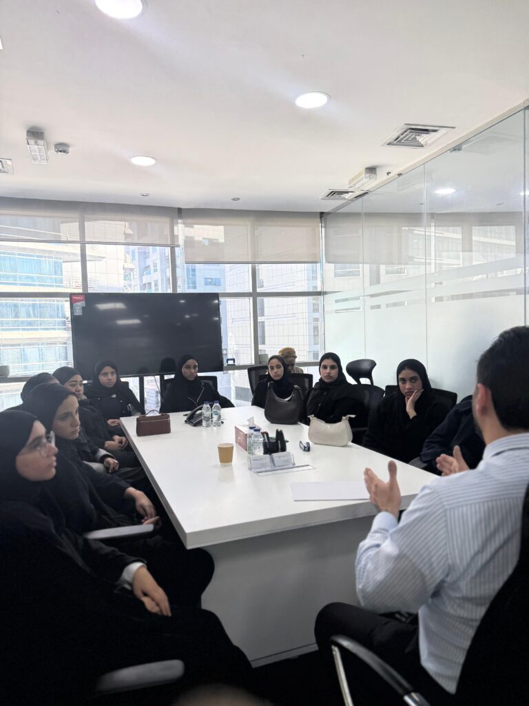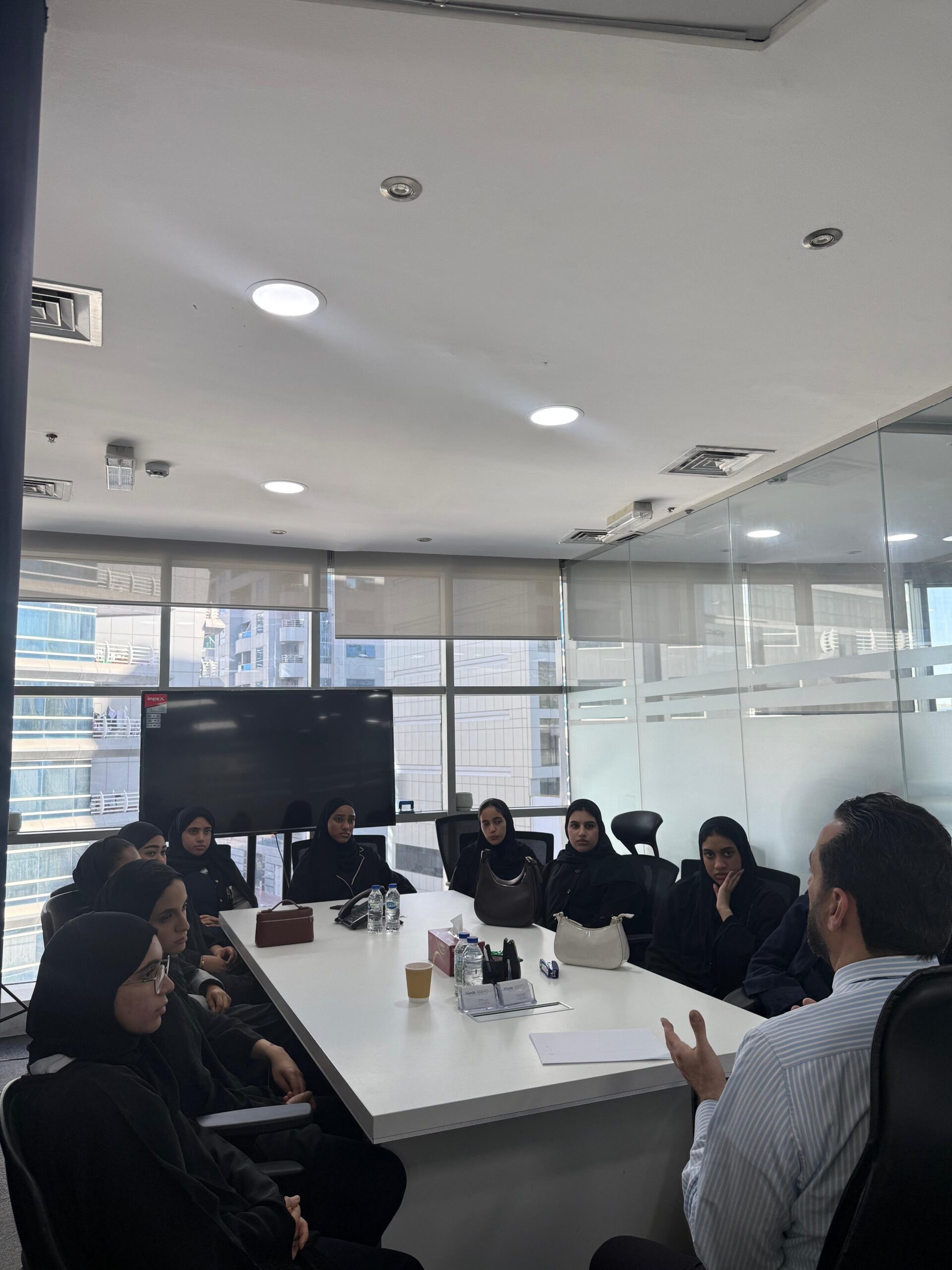 The visit commenced with a welcome session, during which the students were introduced to the firm, its areas of practice, and its role within the UAE’s legal landscape. This was followed by a comprehensive and interactive presentation delivered by the firm’s partners and department heads. The session focused on outlining the academic and professional journey required to become a lawyer in the UAE, including relevant educational pathways, training requirements, and licensing procedures.